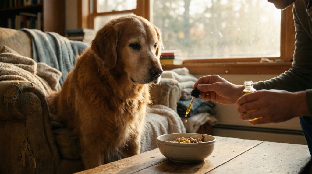 - 직접 급여: 오일이 담긴 스푼을 핥게 하거나, 주사기(바늘 제거)를 이용하여 입안에 직접 넣어주는 방법도 있습니다. 단, 반려견이 스트레스를 받지 않도록 조심스럽게 시도해야 합니다.